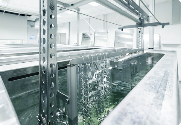 Für die partikel- und silikatfreie Reinigung der Bauteile steht eine leistungsstarke Ultraschall-Reinigungsanlage zur Verfügung. Die Anlage umfasst 7 Ultraschallbecken mit einer Größe von 1250 x 450 x 600 mm.