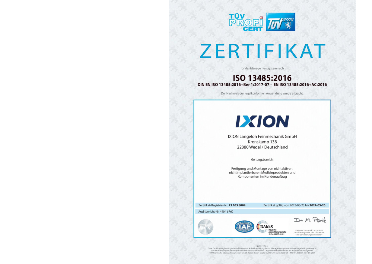 Mit Unterstützung des Beratungsunternehmens QiP GmbH streben wir, die IXION Langeloh Feinmechanik GmbH, für das Quartal vier 2022 die Zertifizierung unseres Qualitätsmanagementsystems gemäß DIN EN ISO 13485 an. Damit spiegeln wir die Qualität unserer Produkte auch in unsere Dokumentation wieder und sorgen für eine erleichterte Zusammenarbeit mit unseren Geschäftspartnern der Medizintechnik.